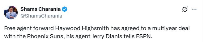 北京时间2月15日,据名记Shams报道,太阳队将与自由球员前锋海伍德-海史密斯签下一份多年合同。太阳队记约翰-甘巴多罗证实了这一消息,并表示海史密斯合同的第二年为部分保障。