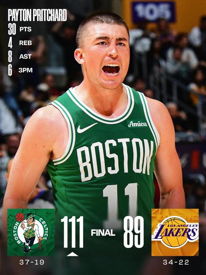 这场焦点战,凯尔特人的最佳第六人普里查德又一次疯狂输出:全场出战38分钟,投篮14中10,三分9中6,罚球4中4,得到30分4篮板8助攻。