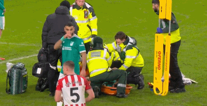 经过数分钟的治疗,远藤航被担架抬出场外,斯洛特被动调整,乔-戈麦斯紧急出战。