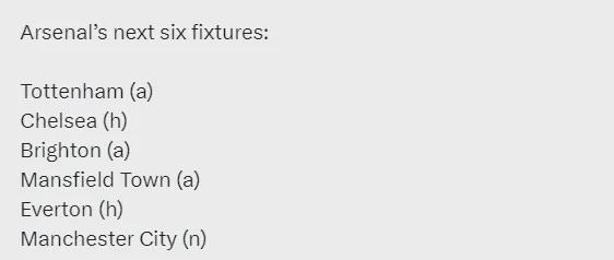 阿森纳未来6场比赛:客战热刺、主战切尔西、客战布莱顿、客战曼斯菲尔德、主战埃弗顿、卡拉宝杯决赛对曼城。