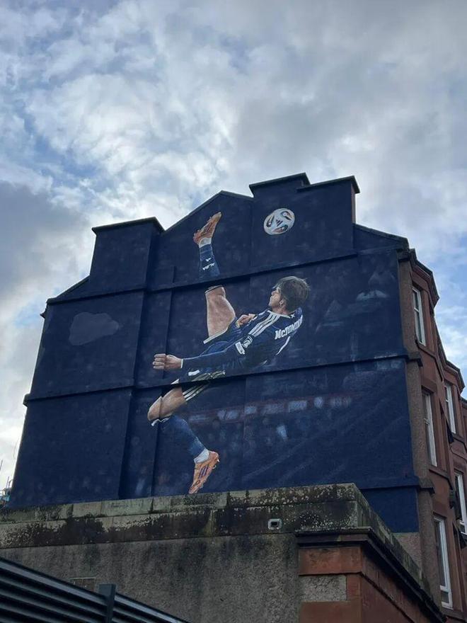 为此,苏格兰球迷在格拉斯哥的萨默维尔大道为他定制了一幅壁画,所在地距离国家队主场汉普顿公园球场仅几百米远,差不多就是一个球门球的距离。苏格兰足协和阿迪达斯合作完成这个作品,由全球街头艺术团队打造完成。