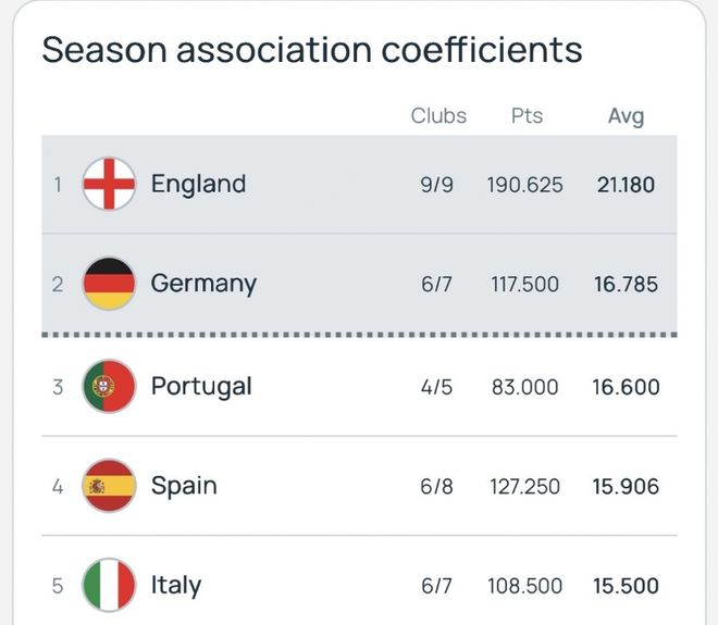 真没落了!欧战积分对比英超领跑实至名归,意甲跌落至第五名