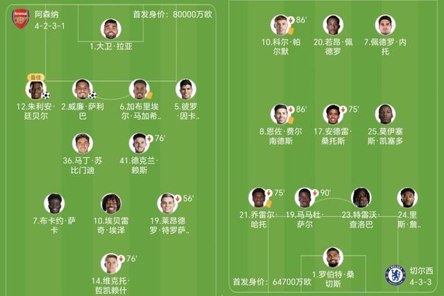 阿尔特塔此战派上哲凯赖什单箭头,身后是萨卡、埃泽和特罗萨德,罗塞尼尔则采用帕尔默、若昂-佩德罗和内托组成进攻三叉戟。